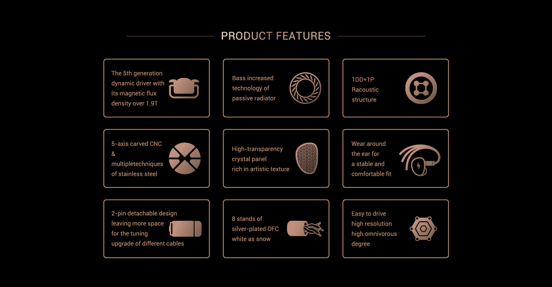 Boson has the patent of innovative 1dd+1pr acoustic architecture and replaceable tuning plug module. 12mm double magnetic circuit double cavity moving coil unit with built-in magnetic flux density exceeding 1.9t